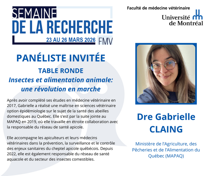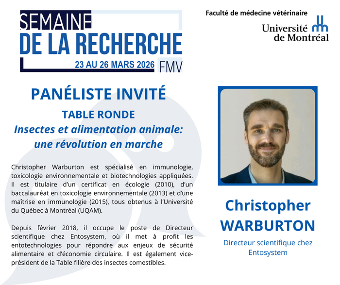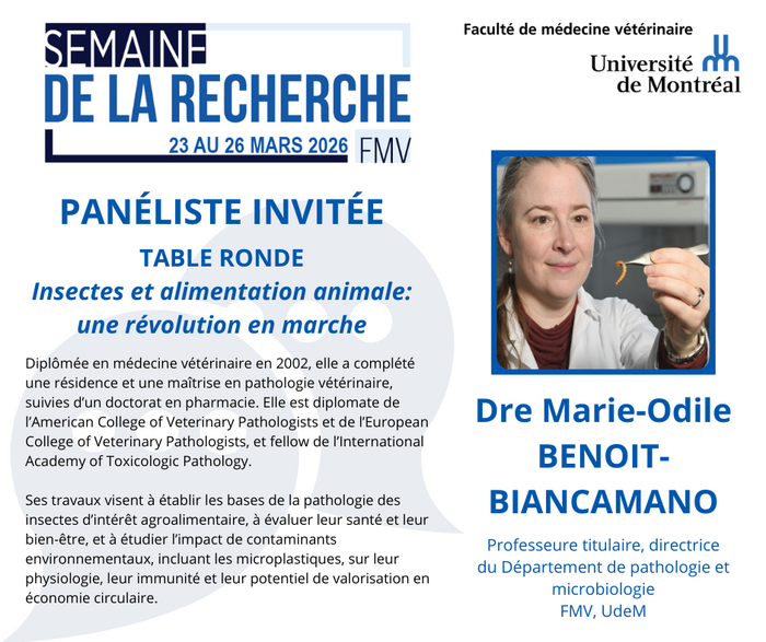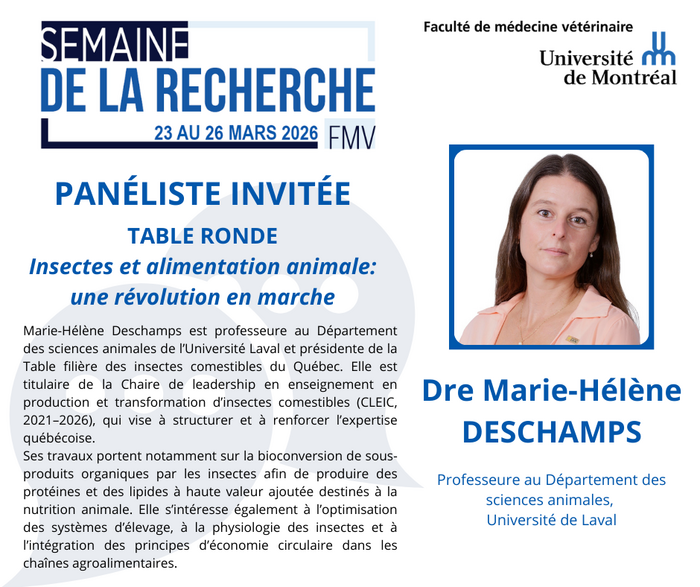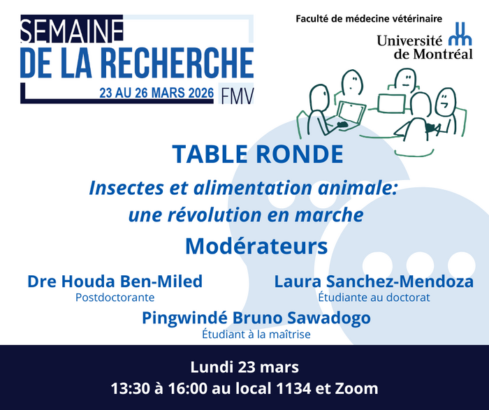 | 13 h 30 à 16 h | Table ronde « Insectes et alimentation animale: une révolution en marche » | Local 1134 et en ligne sur Zoom |