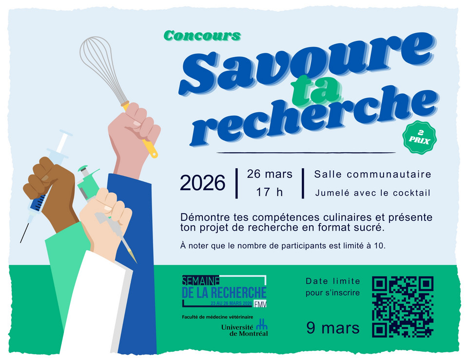 Note : les personnes qui ne sont pas affiliées à l'Université de Montréal peuvent s'inscrire aux activités de la Semaine de la recherche en communiquant par courriel auprès de Maria Zardon à l'adresse suivante : formationcontinue@medvet.umontreal.ca.