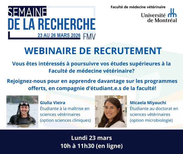 Note : les personnes qui ne sont pas affiliées à l'Université de Montréal peuvent s'inscrire aux activités de la Semaine de la recherche en communiquant par courriel auprès de Maria Zardon à l'adresse suivante : formationcontinue@medvet.umontreal.ca.