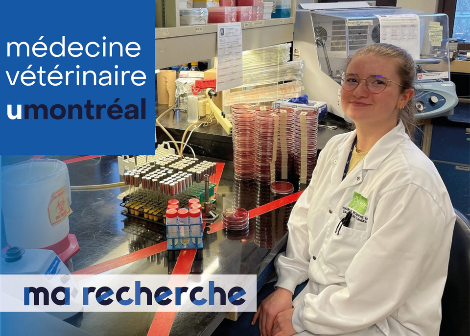 | Je cherche à caractériser l’effet antibactérien d’un mélange de phytodérivés in vitro contre différentes souches d’Escherichia coli pathogène aviaire (APEC), et in vivo sur le microbiote intestinal de la poule pondeuse en pic de ponte | Angèle Eraud, étudiante à la maîtrise (M. Sc.) sous la supervision du Dr Mohamed Rhouma |