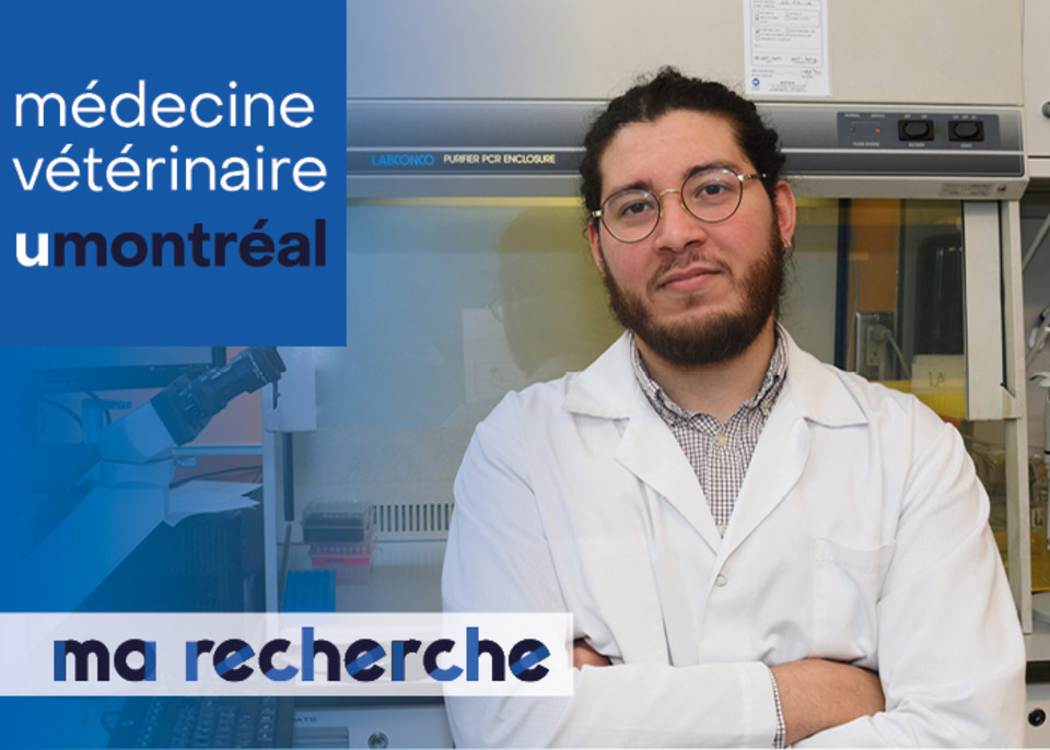 | J'étudie les mécanismes moléculaires des interactions entre l'hôte et le virus de la diarrhée épidémique porcine (VDEP), un coronavirus qui cause d'importantes pertes économiques dans l'industrie porcine mondiale | Mehdi Maury Laouedj, étudiant au doctorat (Ph. D.) sous la supervision du Dr. Levon Abrahamyan. |
