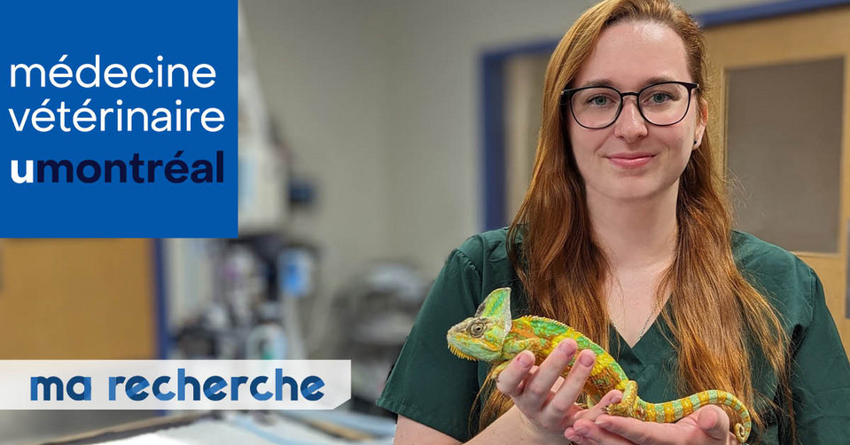 | J'étudie la distribution, l'espérance de vie, la régie et les causes de mortalité principales des caméléons gardés en zoos et aquariums afin d'améliorer la viabilité et le bien-être de ces reptiles en milieu zoologique | Amélie Aduriz, étudiante à la maîtrise (M. Sc.) en sciences vétérinaires, sous la supervision de la Dre Claire Vergneau-Grosset |