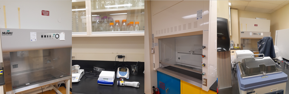 - Le local 1402 (situé près du Presse Café) est disponible et équipé de divers appareils (balance, plaque agitatrice, pH-mètre, microscope, bain-marie, vortex, etc.). Une hotte chimique et une hotte biologique, dûment certifiées, sont aussi disponibles. Pour accéder au local, veuillez contacter M. Frédéric Berthiaume, coordonnateur de laboratoire au vice-décanat à la recherche. Voici la Procédure de fonctionnement du laboratoire.