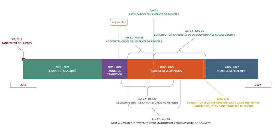 Une année de transition (2021-2022) a ensuite permis d’approfondir certains travaux de l’étude de faisabilité et de se préparer à la co-construction d’une entente de principe pour l’accès et le partage des données en santé animale. Le développement d’un programme de monitorage est prévu pour les années futures (cf. figure 1 et description du Programme de monitorage des antibiotiques en santé animale). Le développement des travaux se fait grâce à un comité d’orientation transdisciplinaire et multifacultaire, cliquez ici pour consulter la composition.